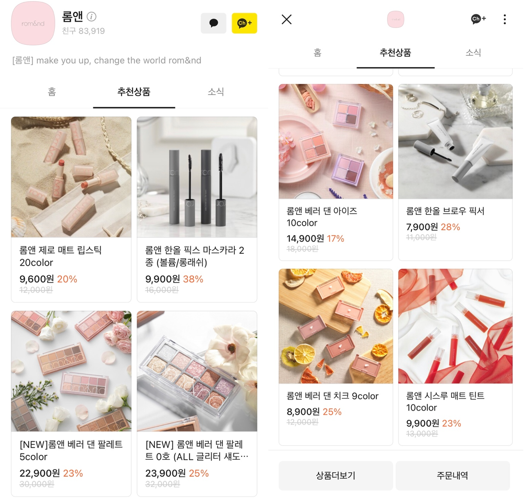 카카오톡 채널 홈에서는 롬앤의 새로운 소식과 상품을 소개하여