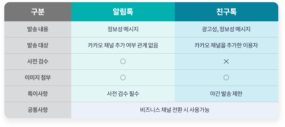 두 서비스의 가장 큰 차이점은 광고성 메시지의 가능 여부인데요,