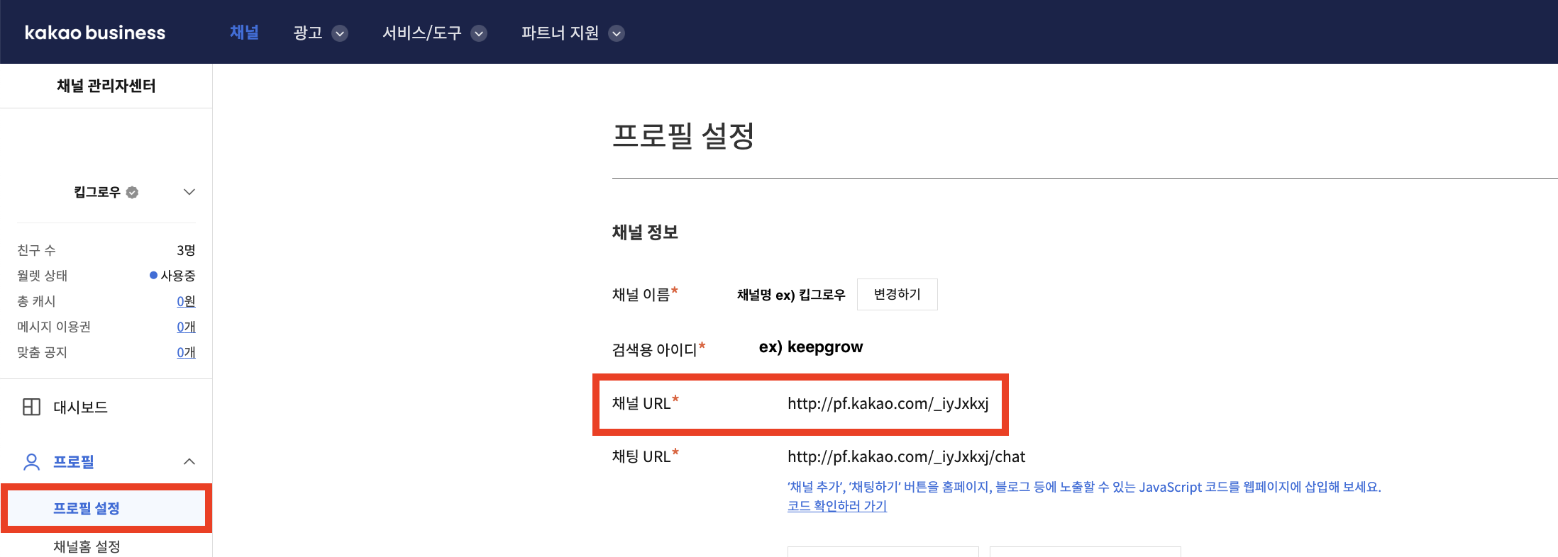 a. 카카오 채널 관리자센터 접속 > 내 비즈니스 > 채널 > 내 채널 클릭 > 프로필 > 프로필 설정 > 채널 URL