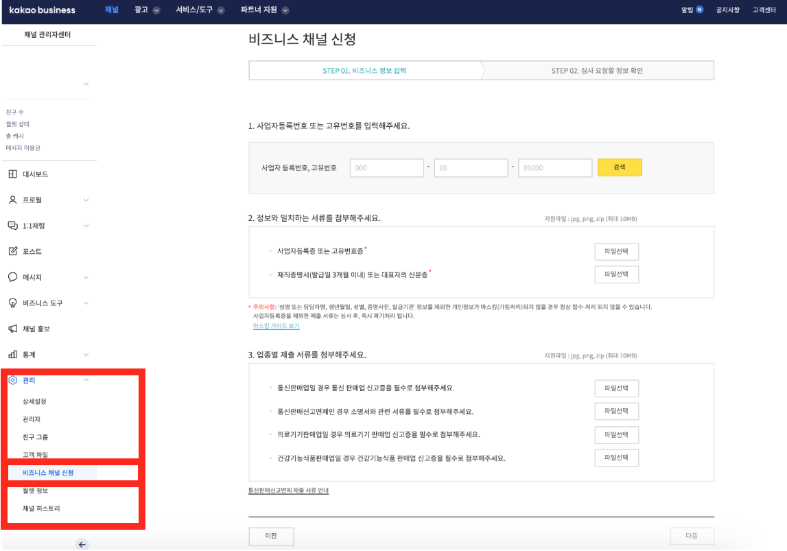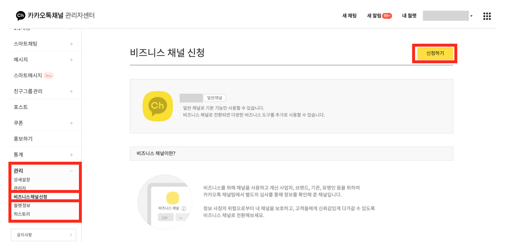 - ① 카카오 채널 관리자센터 접속 > 채널 클릭 > 관리 > 비즈니스 채널 신청 > 신청하기 버튼 클릭