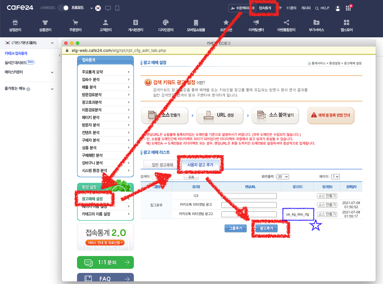 ※ 참고 : 위 광고코드는 아래의 그림과 같이 카페24 접속통계에서 등록할 수 있습니다. 광고코드를 등록한 이후 접두사 'ue_'는 자동으로 붙게 되며, 정상입니다. 그리고 기타 웹 분석 도구에 대한 지원은 지속적으로 확대될 예정입니다. 메이크샵 애널리언스, 에이스카운터, 비즈스프링 등을 사용하시는 고객님께서는 우측 상담톡으로 신청을 주시면 빠르게 업데이트하도록 하겠습니다.