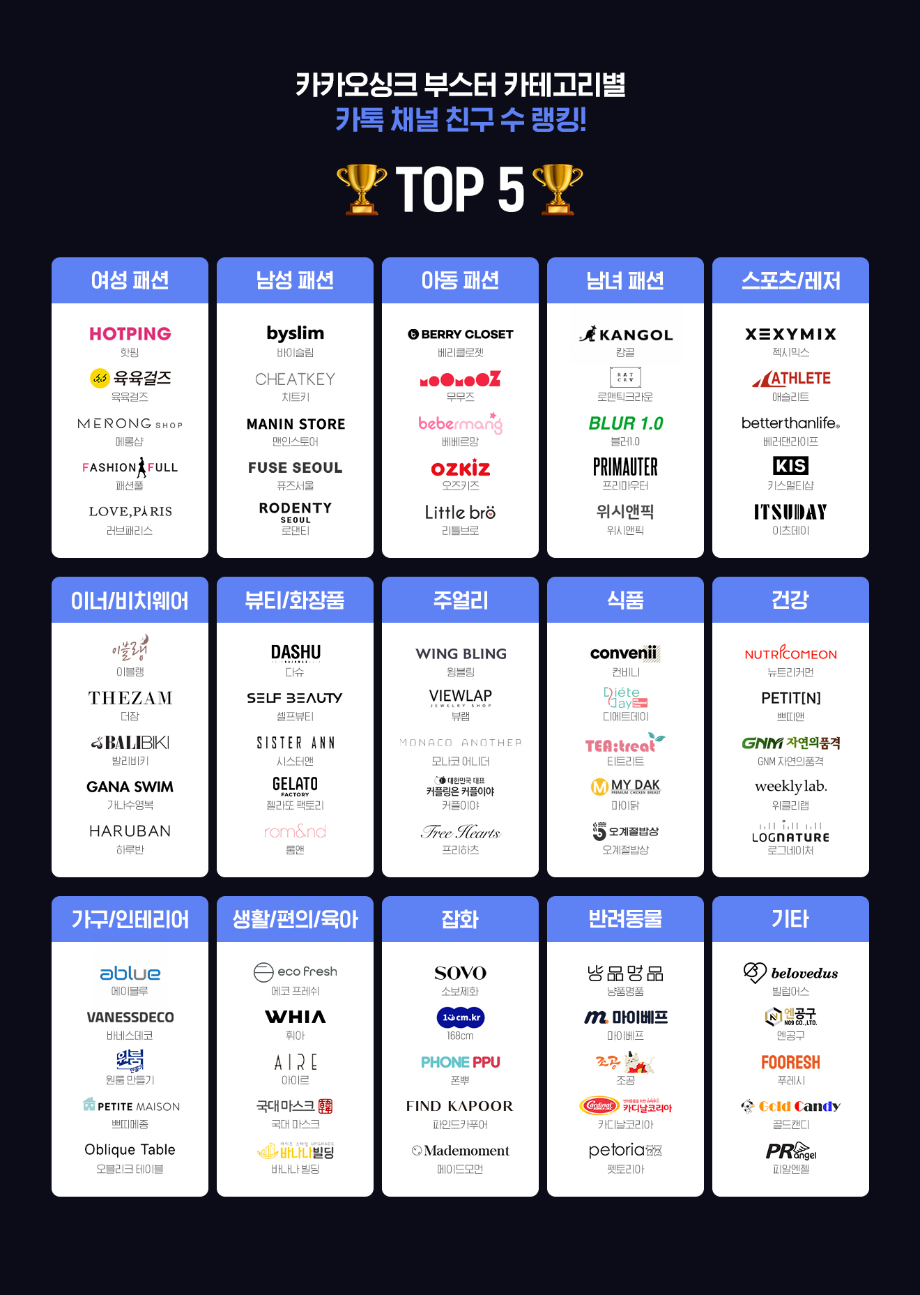 카테고리 별 카톡 채널 친구 수 랭킹 TOP5