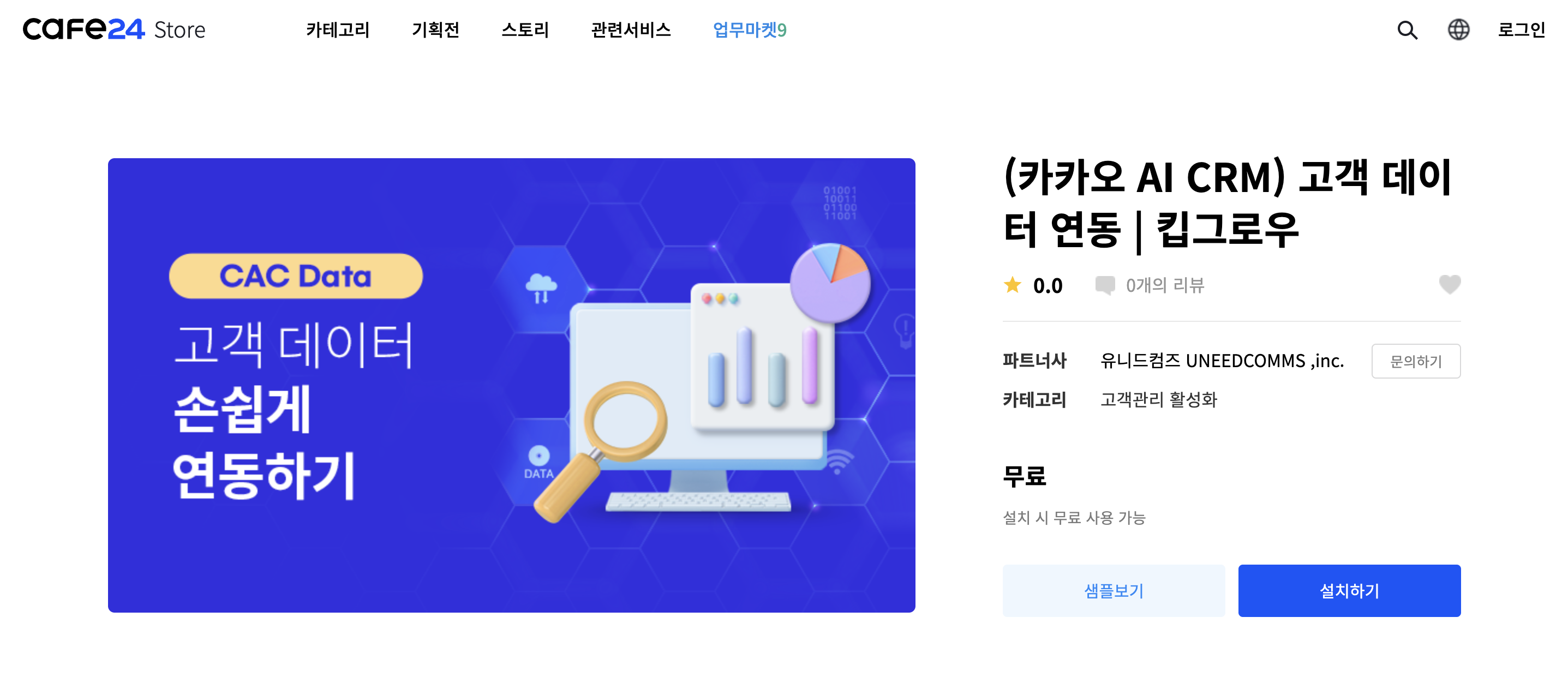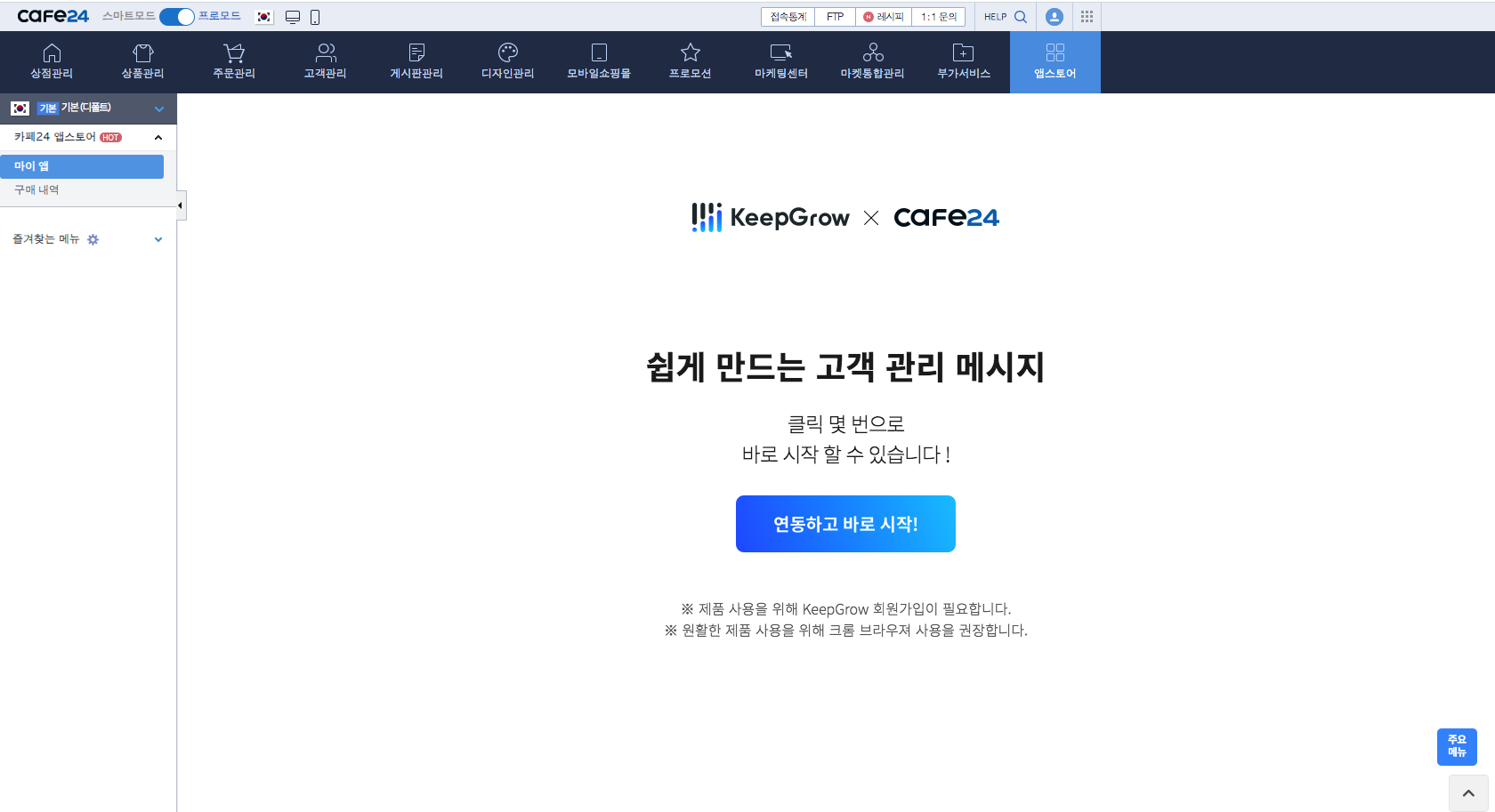 카페24 데이터 연동을 위해서는 카페24 앱스토어에서 킵그로우 고객데이터 연결용 앱을 설치해야 합니다.