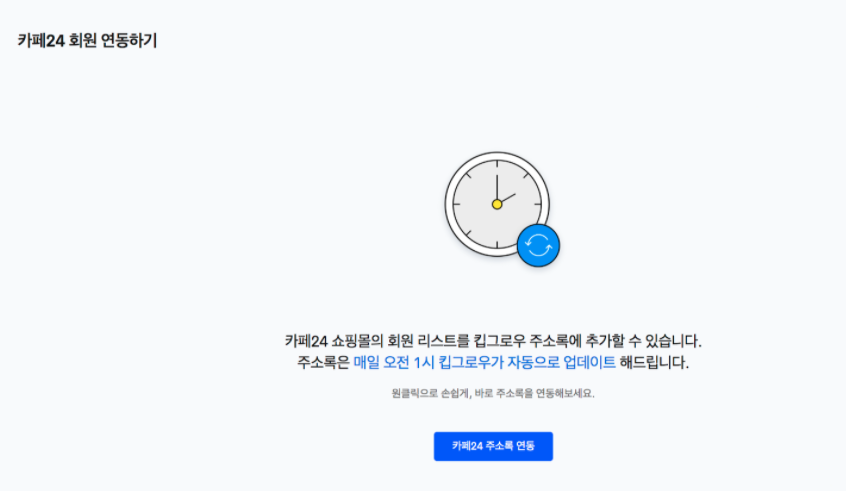 로그인을 하시면, 연동하기 화면이 나타나고 [카페24 고객데이터 연동] 버튼을 누르면 연동이 됩니다!
