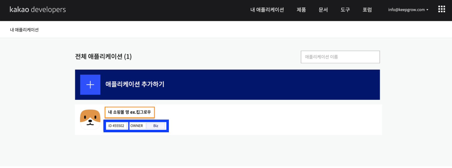■STEP2. 비즈앱ID(Owner) 확인 필요 ( * 파란색 네모 영역을 확인해주세요.)