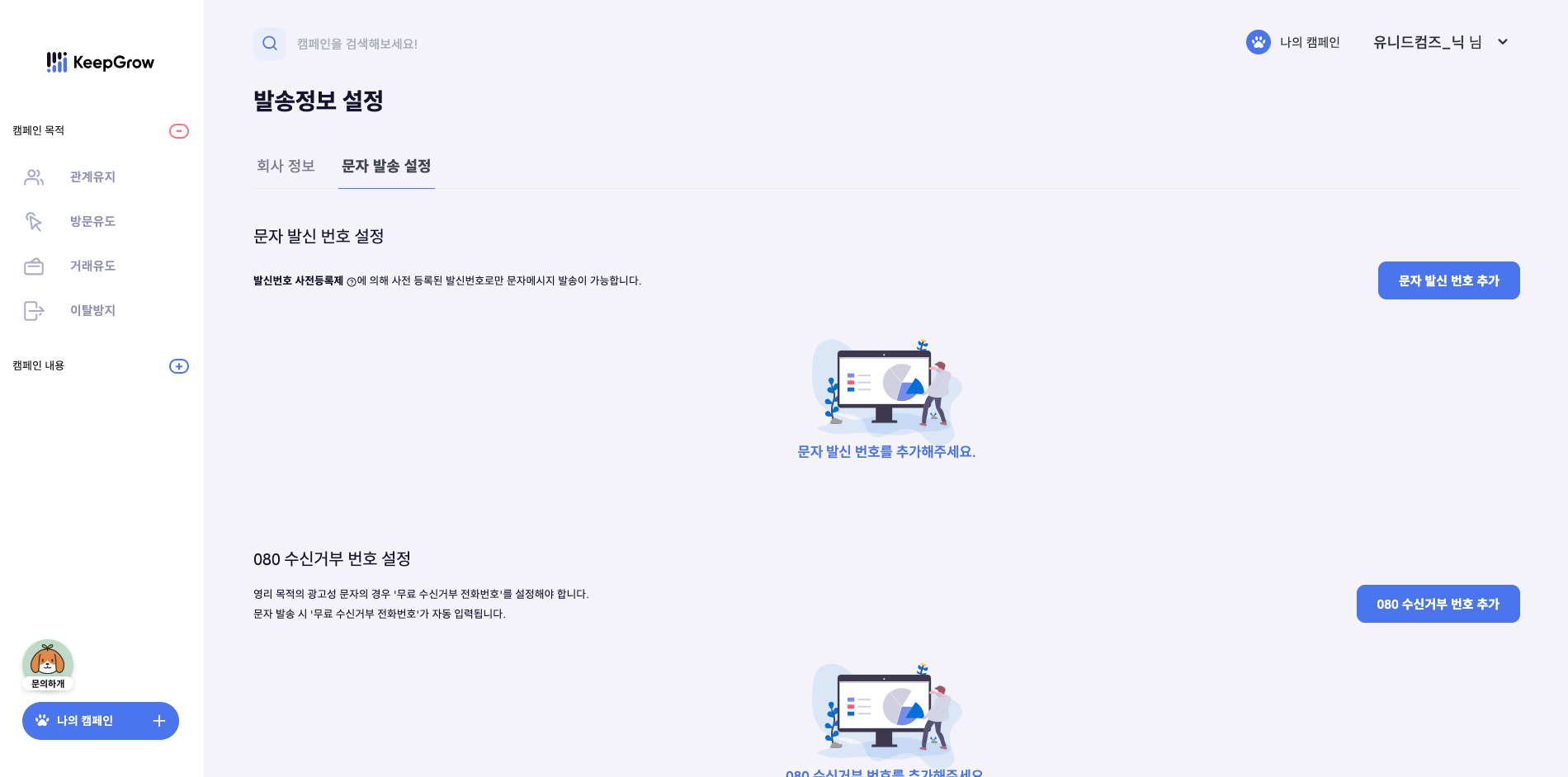 상단 오른쪽 이름 옆 화살표 > 설정메뉴 > 캠페인 발송 정보 > 문자 발송 정보 를 선택하면 나오는 화면에서 [문자 발신 번호 추가] 버튼을 클릭합니다.