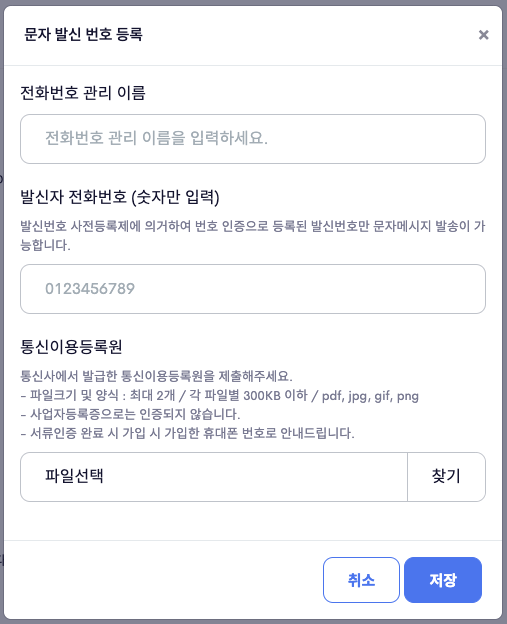 - 문자를 보내려면 (국가에서 지정한 형식대로) 발신번호를 사전 등록해야 한다.