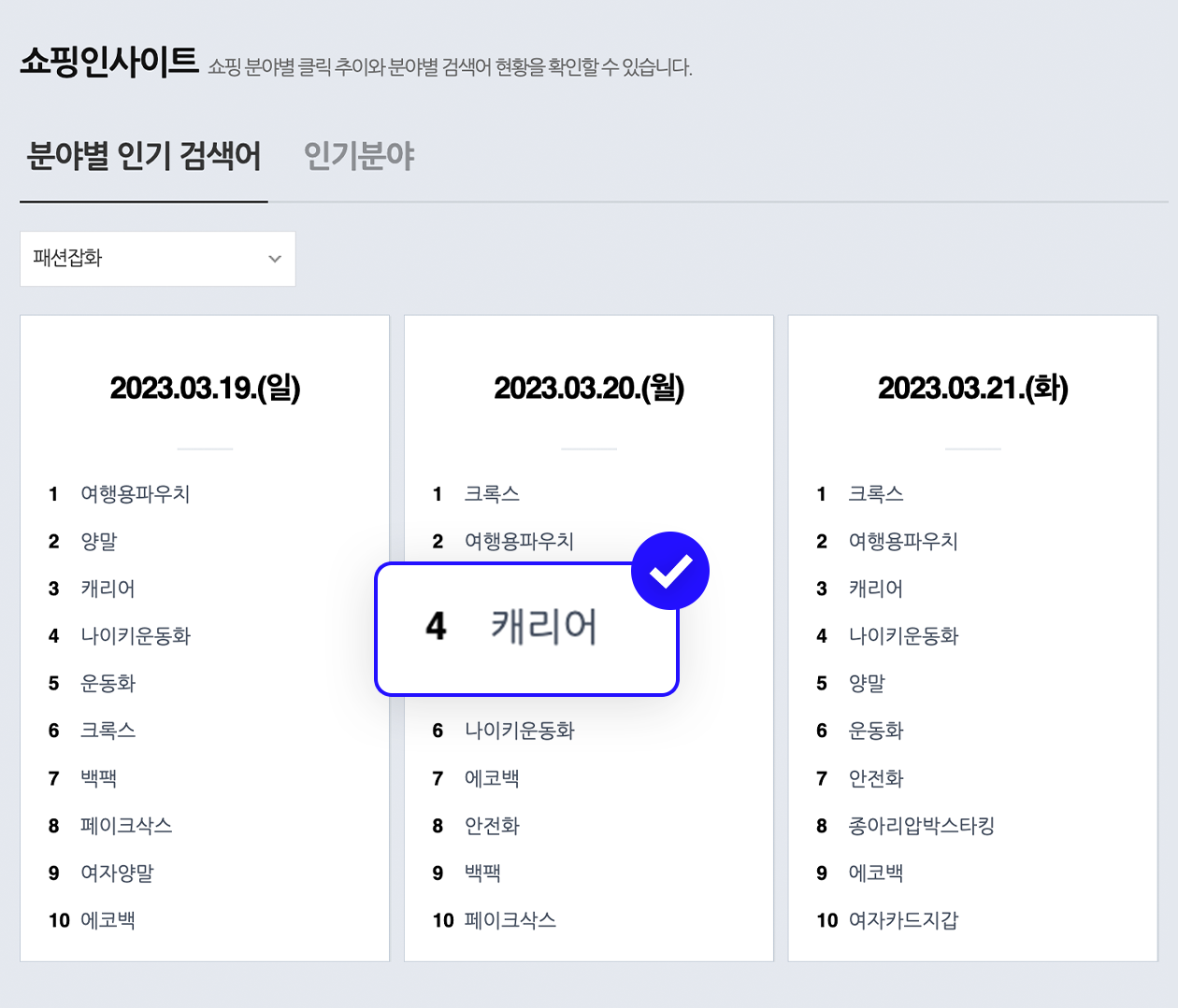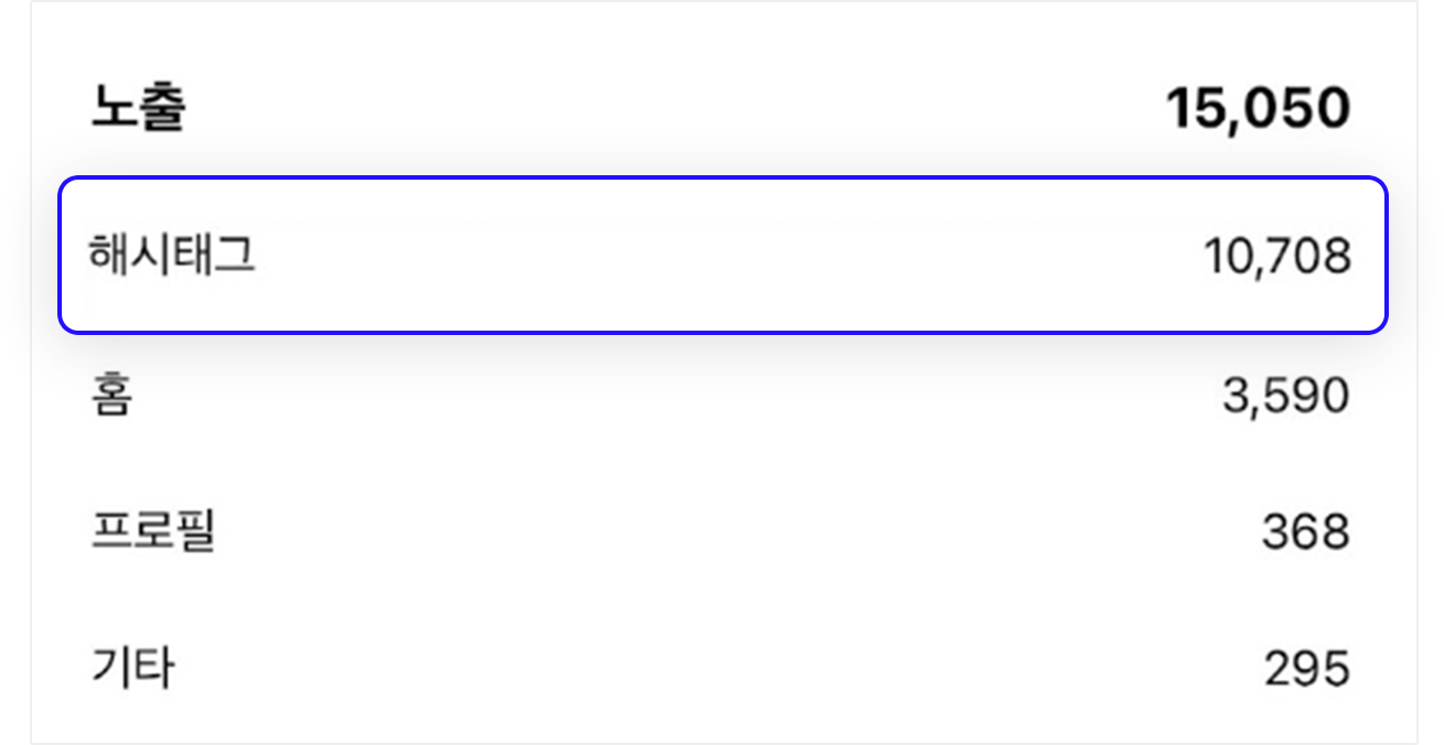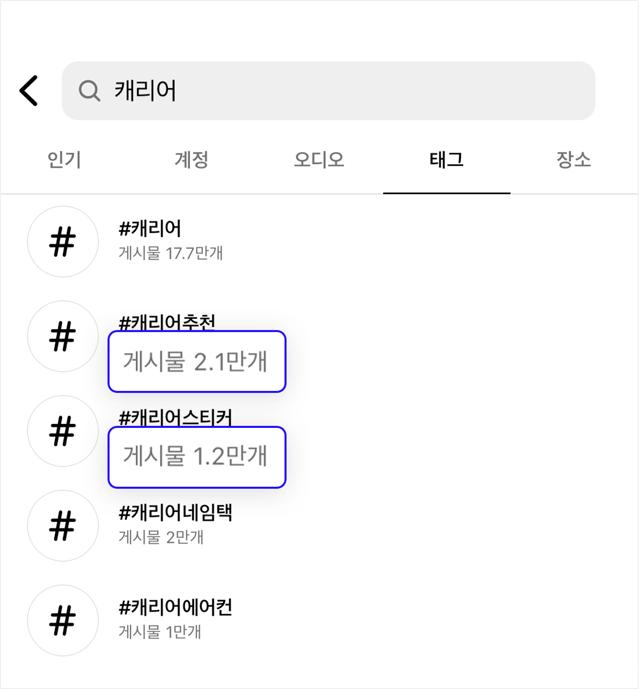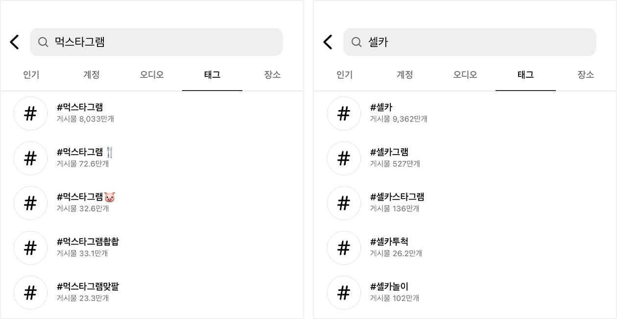 "게시물 수"를 비교하면 해시태그의 규모를 확인할 수 있습니다.