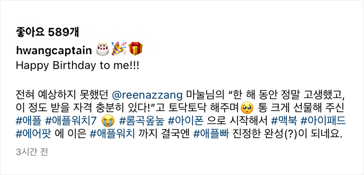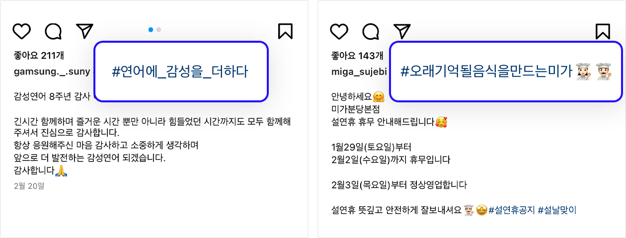적절하게 섞여 들어간 해시태그는 강조 포인트를 잘 살려주고 있어요.